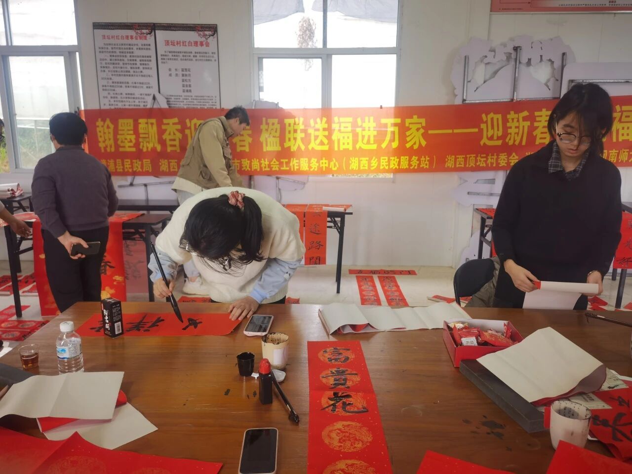 师生携手顶坛村驻村第一书记、致尚社工湖西站及顶坛村委会,走进作为闽台文化交融地、藏有全国重点文物保护单位蓝廷珍纪念馆的漳浦县湖西镇顶坛村,开展“妙笔迎新春,泼墨赠祝福”义写春联活动,将一幅幅寓意吉祥的春联与福字送到古村群众手中,用实际行动传递关怀,让乡亲们在冬日中感受到新春的温暖与社会的情谊。