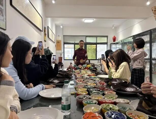 同学们沉浸式观摩珍品、记录工艺细节,亲身参与制作,从瓷片剪切到镶嵌拼接,在实操中体悟工艺精髓,深入思考“传统工艺材料创新”“非遗与现代美术教学融合”等专业问题,实现从“技艺体验”到“学术探究”的跨越。