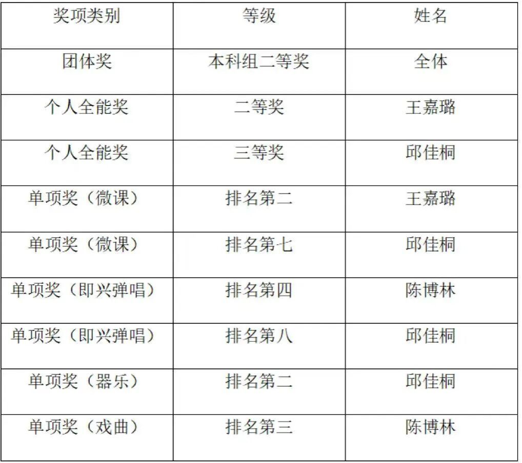 在音乐教育专业基本功展示中,成人抖音 荣获本科组团体二等奖。个人奖项方面,王嘉璐同学获得个人全能二等奖及微课单项奖;邱佳桐同学获得个人全能三等奖及微课、即兴弹唱、器乐单项奖;陈博林同学斩获即兴弹唱与戏曲两个单项奖,展现出全面的音乐素养。